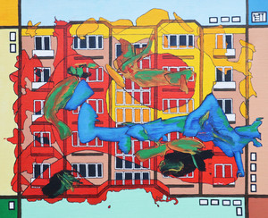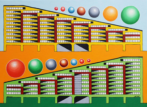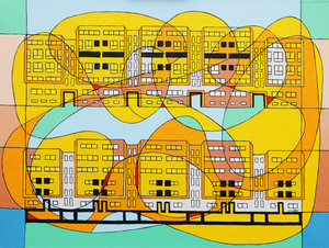 2021Een beeld van een van de gebouwen waar ik gewoond heb en waar ik gekleurde ballen aan heb toegevoegd. Met de ballen probeer ik ronde vormen aan de abstracte lijncompositie toe te voegen.