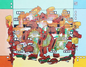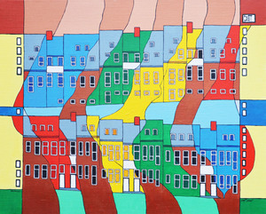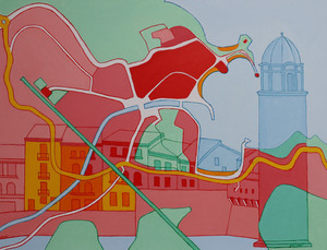 2021Met dit schilderij deed ik mee voor een expositie, maar werd niet uitgenodigd. Het onderwerp was symbolen. Het is de plattegrond van Zuid Limburg met afbeeldingen van gebouwen uit Maastricht.