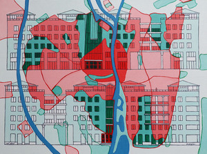 2021Een combinatie van de plattegrond van Maastricht met de gevels van ons flatgebouw aan de Mosalunet.